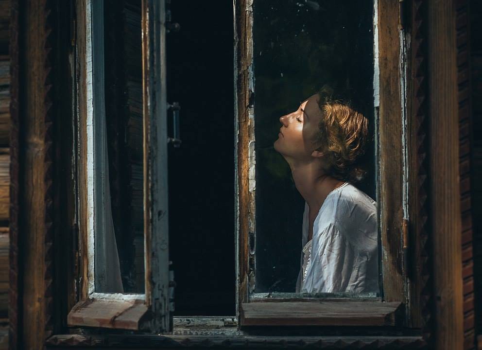 Тифлокомментарий: сцена из спектакля. За приоткрытым окном без занавесок в профиль сидит девушка в белой просторной рубашке. Глаза ее закрыты, голова запрокинута. Русые волосы собраны ниже затылка.