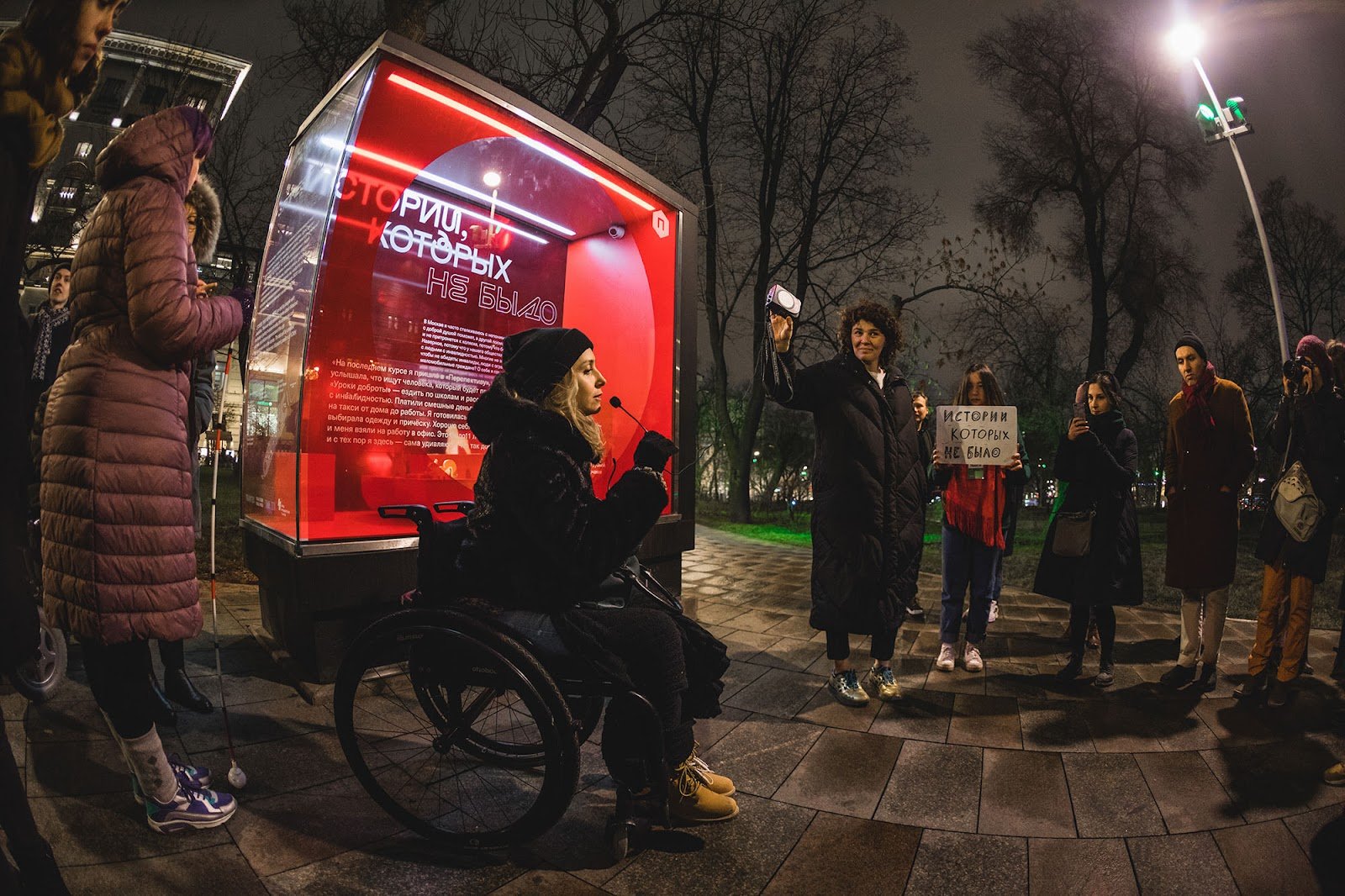 Тифлокомментарий: цветная фотография. В сквере темно, горят фонари. Люди в верхней одежде стоят полукругом около витрины с красными полупрозрачными стеклами. Люминесцентные лампы наполняют витрину белым светом. На заднем стекле крупная белая надпись: «Истории, которых не было». Под ней и на остальных стеклах — цитаты более мелким шрифтом. Спиной к витрине сидит девушка в инвалидной коляске, держит у лица микрофон. Рядом стоят женщина с динамиком в руках и девушка с белой табличкой, на которой от руки написано название выставки. Слева стоит женщина с белой тростью, из-под капюшона, надетого на голову, виднеются фиолетовые волосы.