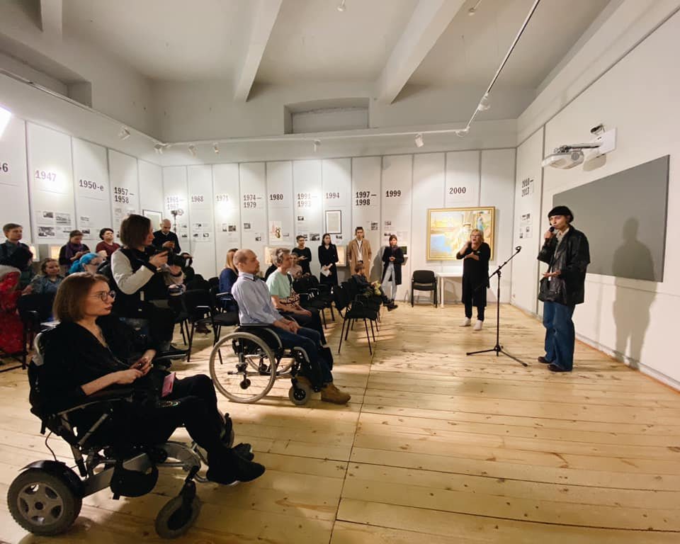 Тифлокомментарий: цветная фотография. В просторном зале музея проходит презентация. Перед стойкой микрофона стоит молодая женщина, что-то рассказывает. У нее темное каре и мешковатая одежда: синие джинсы и черная куртка, через плечо перекинута объемная сумка. Позади нее серый экран и проектор. Справа от выступающей стоит блондинка средних лет — это сурдопереводчик. В первом ряду сидят мужчина и женщина в инвалидных колясках. Между ними стоит девушка с фотоаппаратом в руках. Остальные слушатели сидят на стульях, выстроенных рядами, стоят, прислонившись к стенам. Стены обшиты светлыми панелями. На них указаны даты важных событий в истории Москвы в хронологическом порядке, а также представлены документальные материалы к ним.