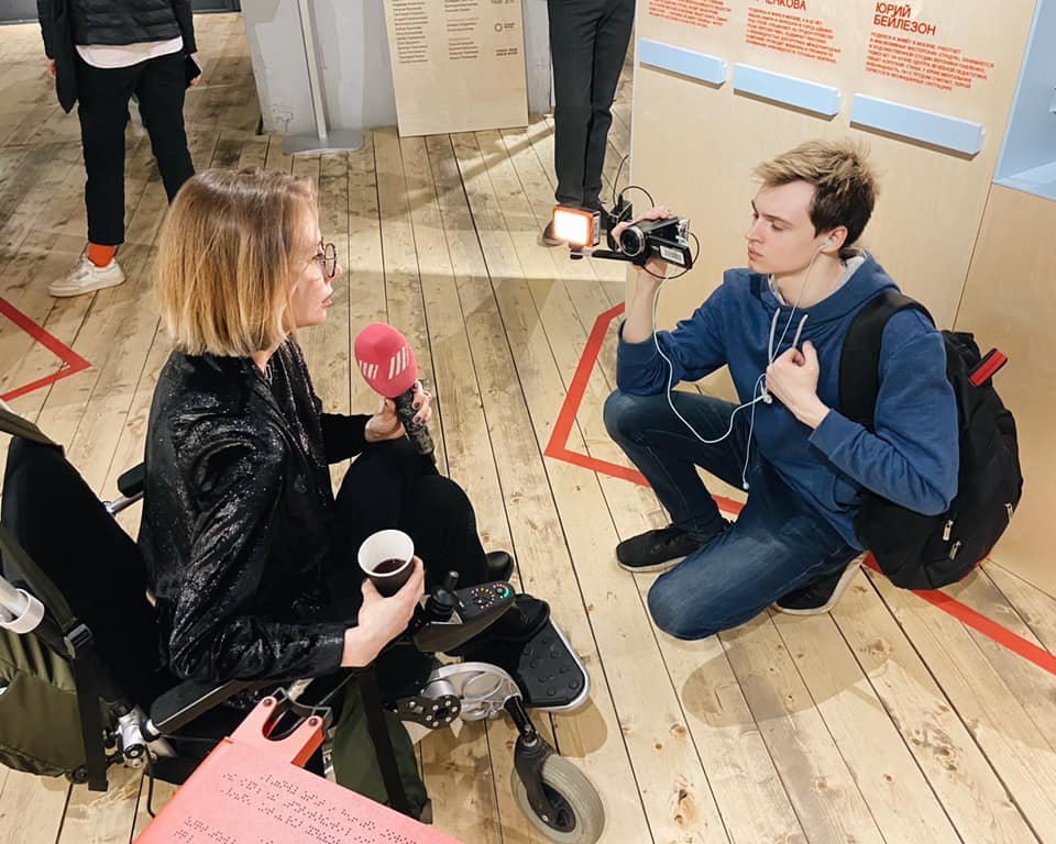 Тифлокомментарий: цветная фотография. Вид чуть сверху. Парень берет интервью у девушки в инвалидной коляске, что была на презентации. У нее светло-русые волосы, каре, тонкие черты лица, очки в круглой оправе, черный наряд. В левой руке она держит микрофон, в правой — стаканчик с кофе. Парень сидит перед ней на корточках, держит в руках небольшую видеокамеру, внимательно смотрит на экран. У него короткие взъерошенные светлые волосы. На нем синяя толстовка, синие джинсы и черные кеды, за спиной черный рюкзак. Вокруг них стоят бежевые информационные стенды, ходят посетители.