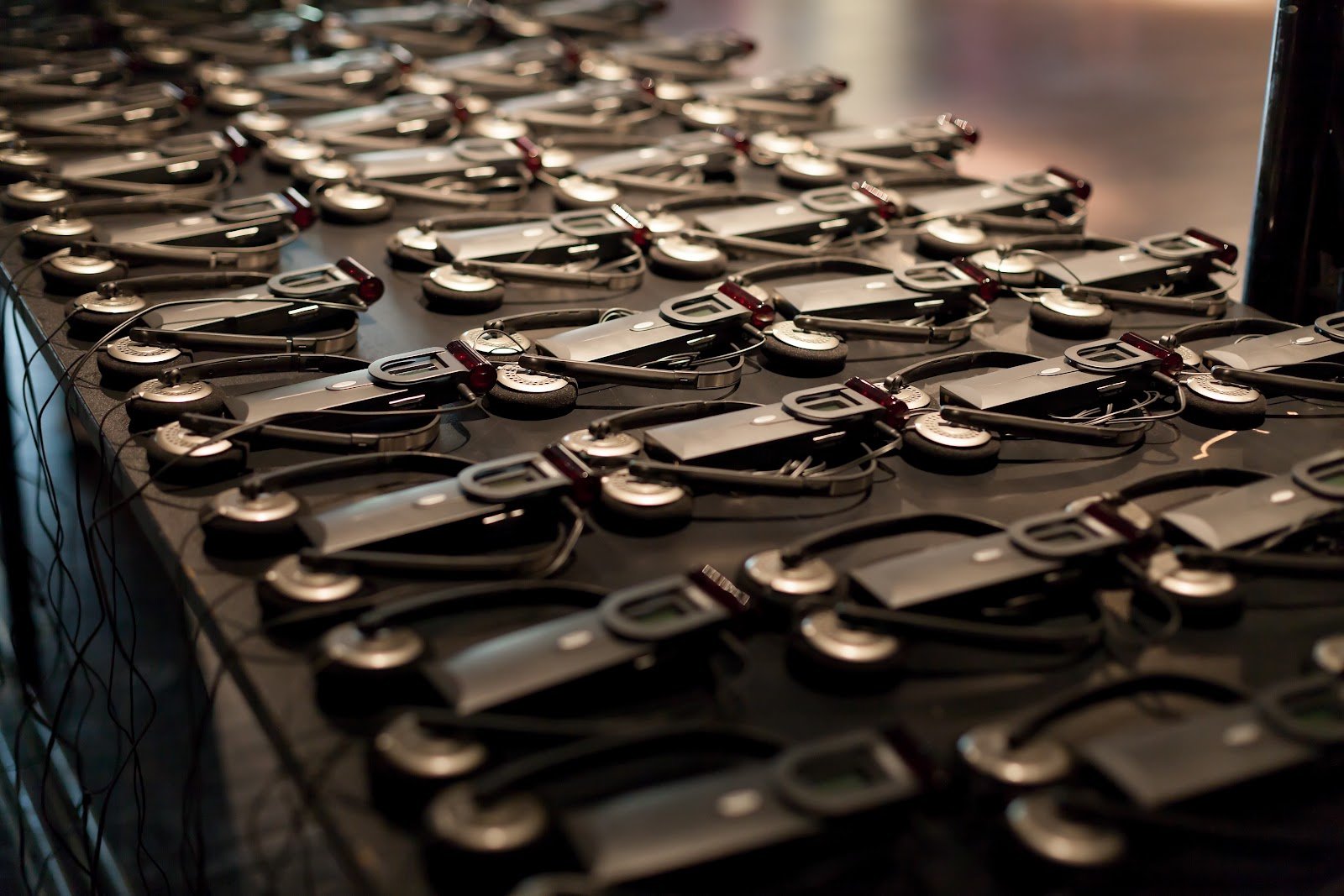 Тифлокомментарий: цветная фотография. На столе — большое количество черных приемников для синхронного перевода с накладными наушниками. Приемники выложены ровными рядами.