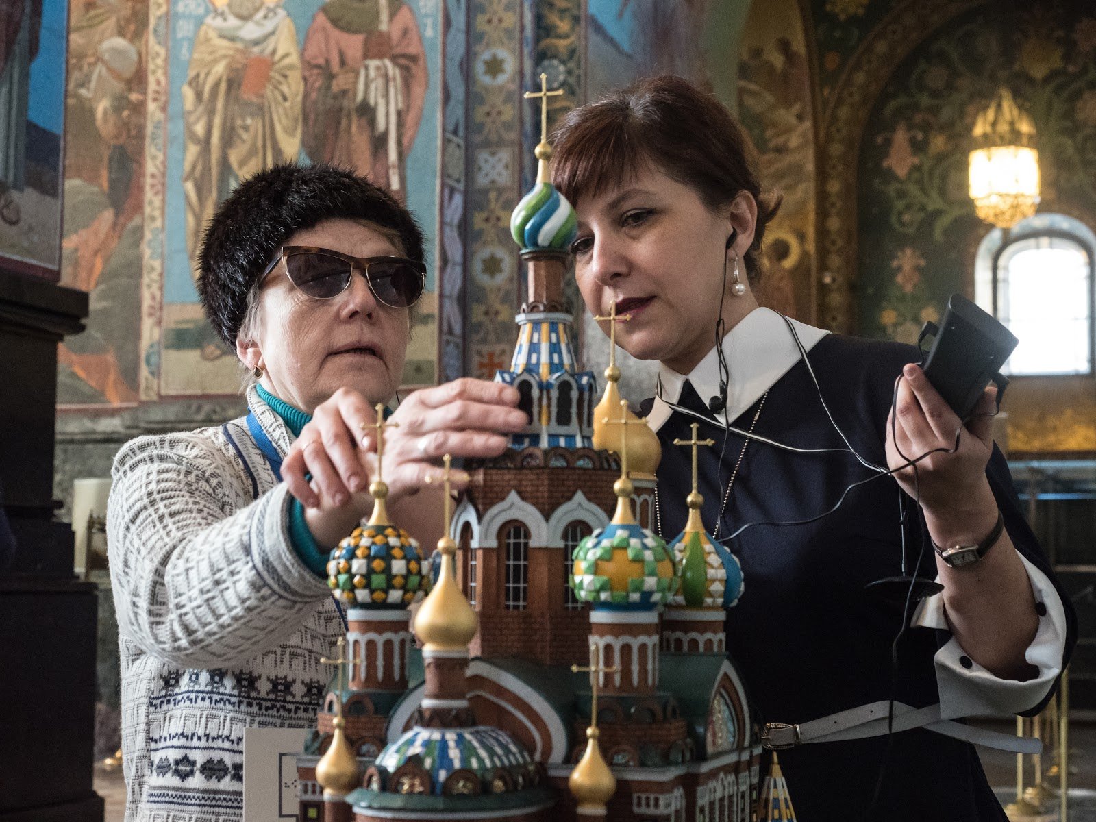 Тифлокомментарий: цветная фотография. Внутри храма, на фоне росписи на стенах стоят две женщины. Перед ними — тактильная модель Храма Спаса на Крови. Макет в точности повторяет все цвета и фрагменты великого произведения русского зодчества. Женщина справа — с вставным наушником и приемником в руке — держит за запястье другую женщину в темных очках. Она пальцами правой руки касается верхушки главного шатра храма, который завершает фонарь, увенчанный луковичной главкой с крестом. Главка покрыта белой, желтой и зеленой краской в виде обвивающих ее цветных полосок.