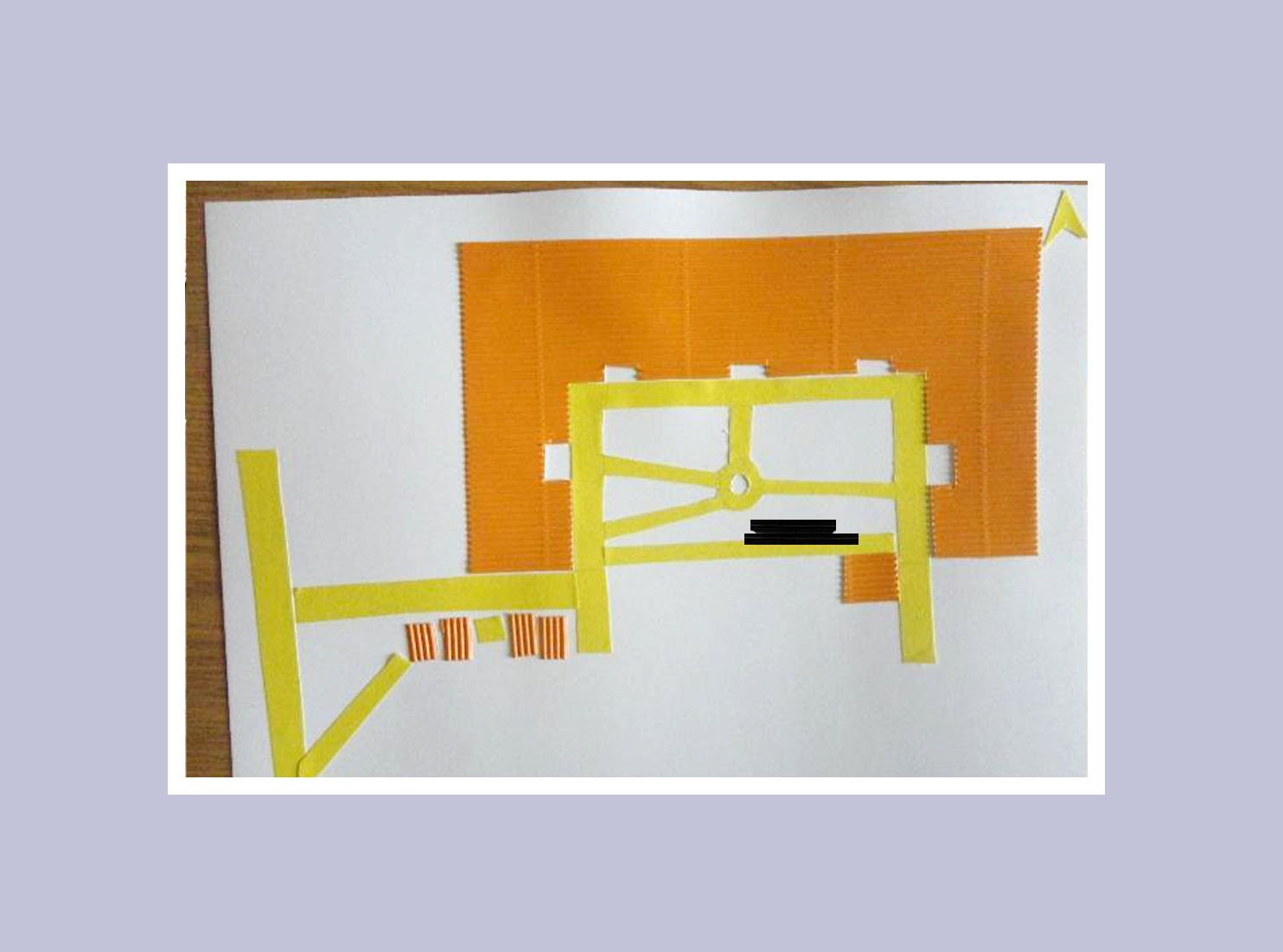 Тифлокомментарий: цветная фотография в широкой сиреневой рамке. На столе лежит аппликация на белом картоне из оранжевой гофрированной и желтой бархатной бумаги. Аппликация изображает план п-образного дома с пятью подъездами-вырезами; вдоль подъездов и через двор идут пешеходные дорожки, еще одна дорожка ведет в сторону. Вдоль дорожки обозначены отдельно стоящие квадратные и прямоугольные строения. В правом верхнем углу — желтая стрелка вверх, она указывает на север.