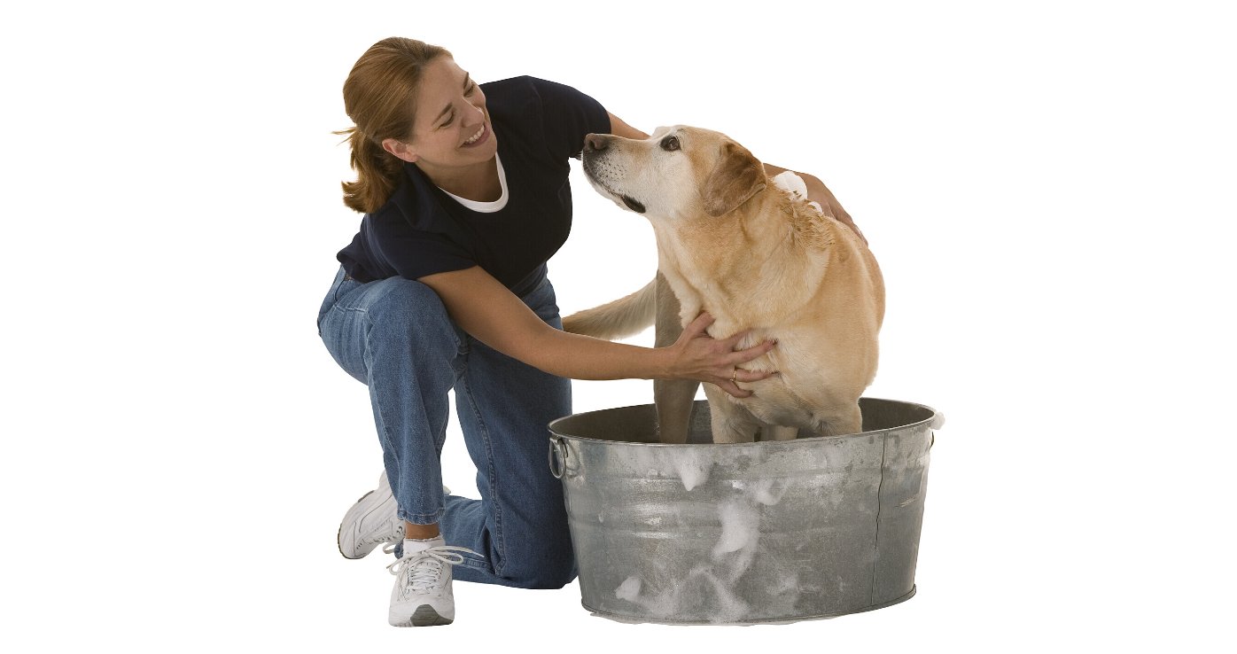 Тифлокомментарий: цветная фотография. Девушка моет палевого лабрадора в высоком алюминиевом тазу. На ней темно-синяя футболка, голубые джинсы, белые кроссовки. Она стоит на одном колене, улыбаясь, смотрит на собаку. Одной рукой девушка придерживает лабрадора за грудь, другой — намыливает ему спину. По стенкам таза стекает густая пена.