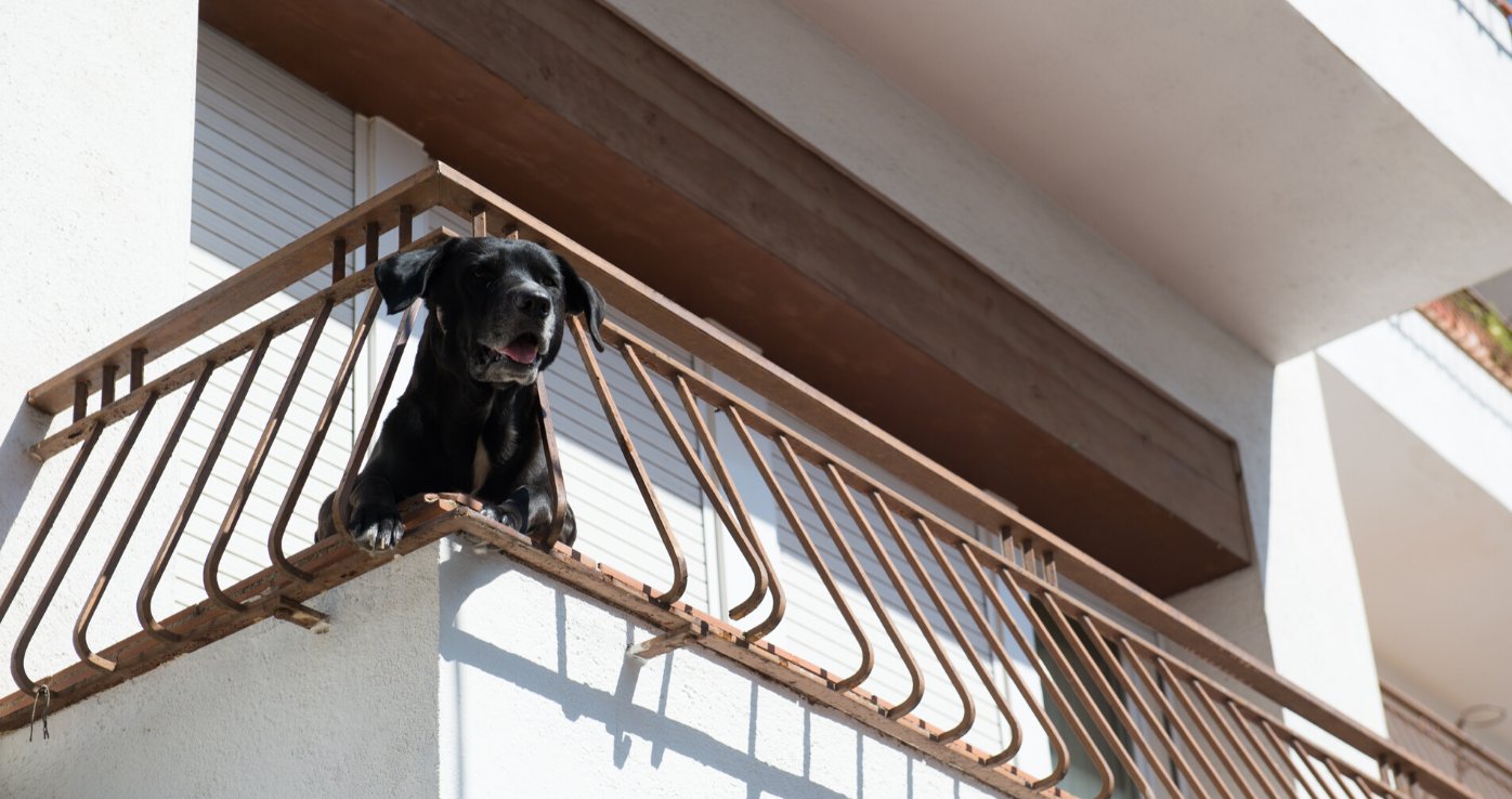 Тифлокомментарий: цветная фотография. Вид снизу на балкон жилого дома. Черный лабрадор просовывает голову между прутьями металлической балконной решетки. Он положил лапы на край балкона и приоткрыл пасть. Входная дверь и окна балкона закрыты белыми жалюзи.