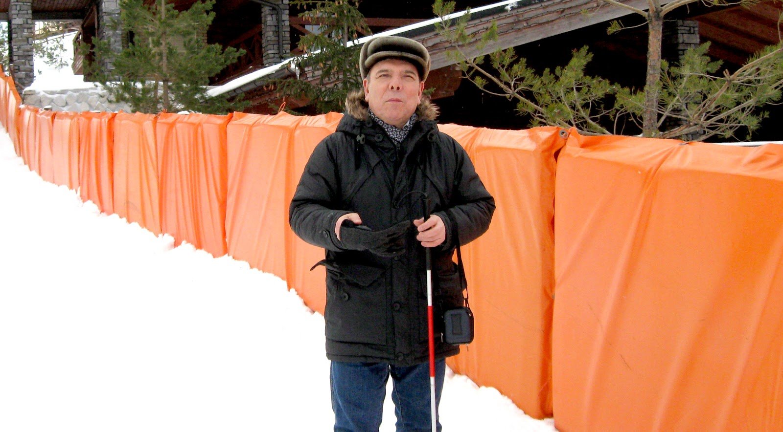 Тифлокомментарий: цветная фотография. Эдуард Иванов — невысокий мужчина средних лет — стоит на пустой заснеженной улице. У Эдуарда широкое лицо с высокими скулами и вздернутый нос. Он одет в джинсы и темную куртку, на голове меховая шапка с козырьком, на шее шарф с геометрическим узором. В левой руке Эдуард держит трость, в правой — перчатки. Он стоит у оранжевого ограждения, которое тянется вдоль улицы. Из-за ограждения виднеются елки и деревянное строение с покатой крышей.