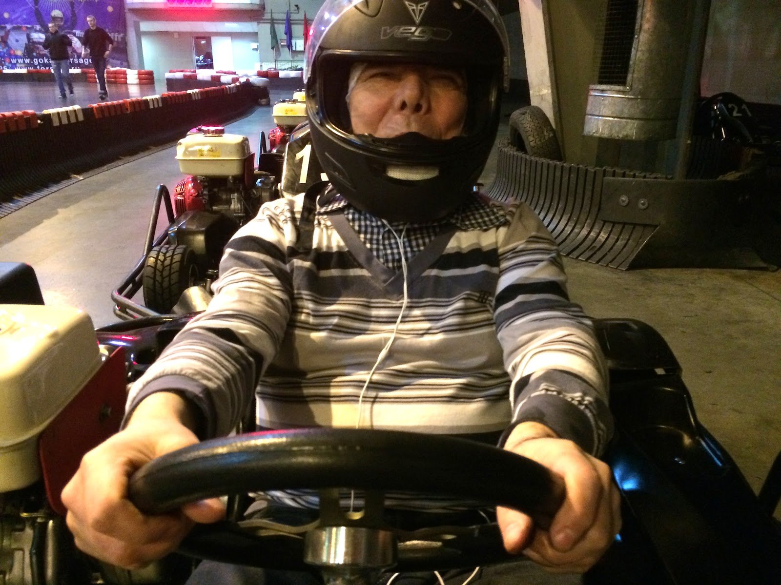 Тифлокомментарий: цветная фотография. Крытый картодром. Эдуард сидит за рулем карта. На нем черный шлем с поднятым визором, из-под шлема тянется провод от наушников.