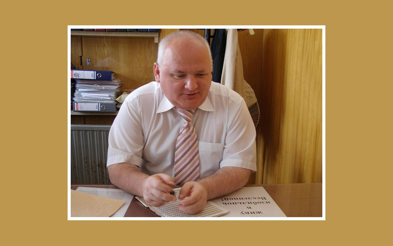Тифлокомментарий: цветная фотография. За столом в кабинете сидит Руслан Дзалаев — полноватый мужчина лет пятидесяти. У него седые коротко стриженные волосы, круглое добродушное лицо. На Руслане белая рубашка с коротким рукавом и галстук с бежевыми и розовыми полосками. На столе перед ним лежит прибор для письма по Брайлю, позади на полке стопкой уложены папки и файлы с бумагами. Руслан, жестикулируя, говорит о чем-то с легкой улыбкой.