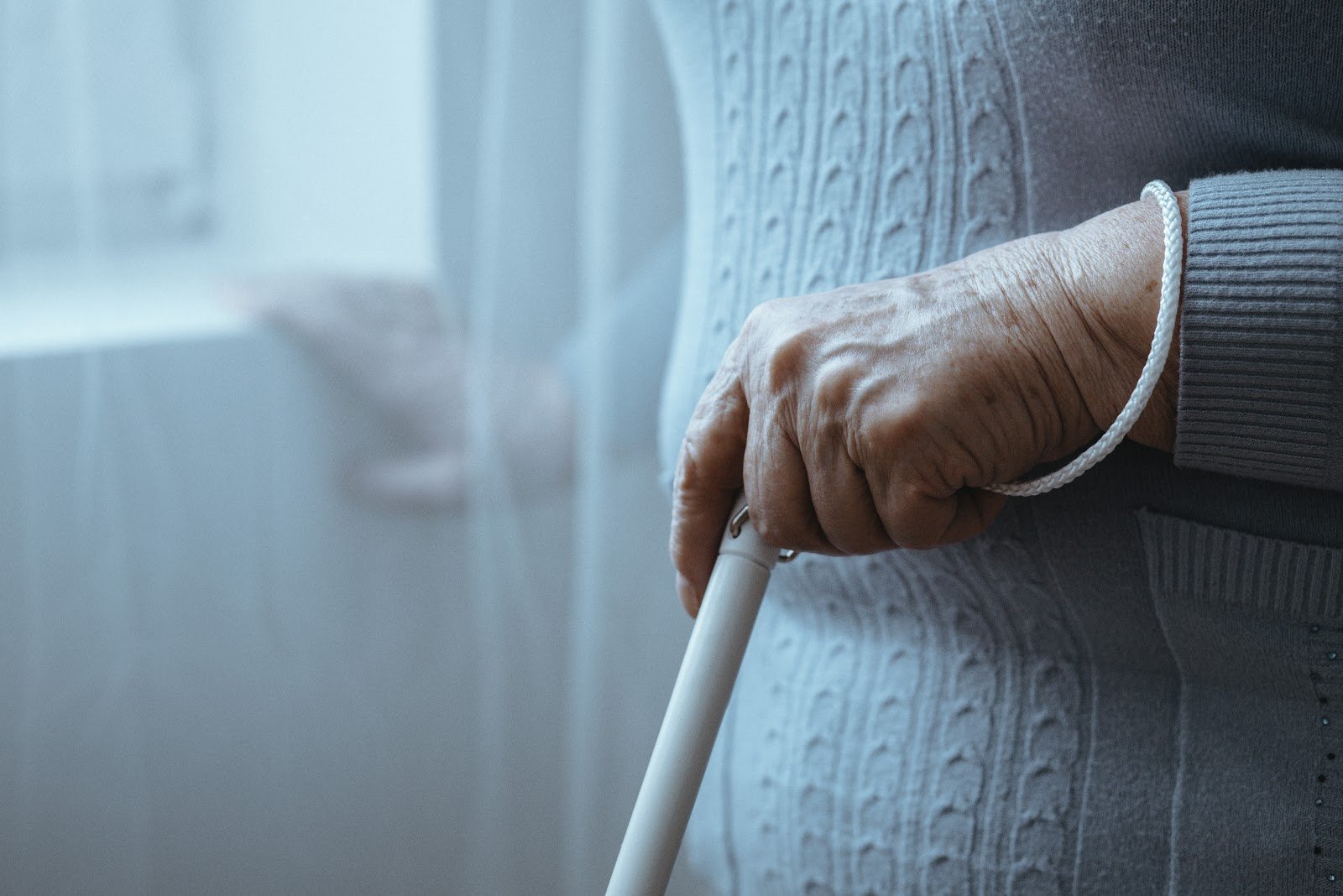 Тифлокомментарий: цветная фотография. Пожилой человек стоит у окна, положив правую руку на подоконник. Левой рукой он опирается о белую трость, шнурок трости накинут на запястье.