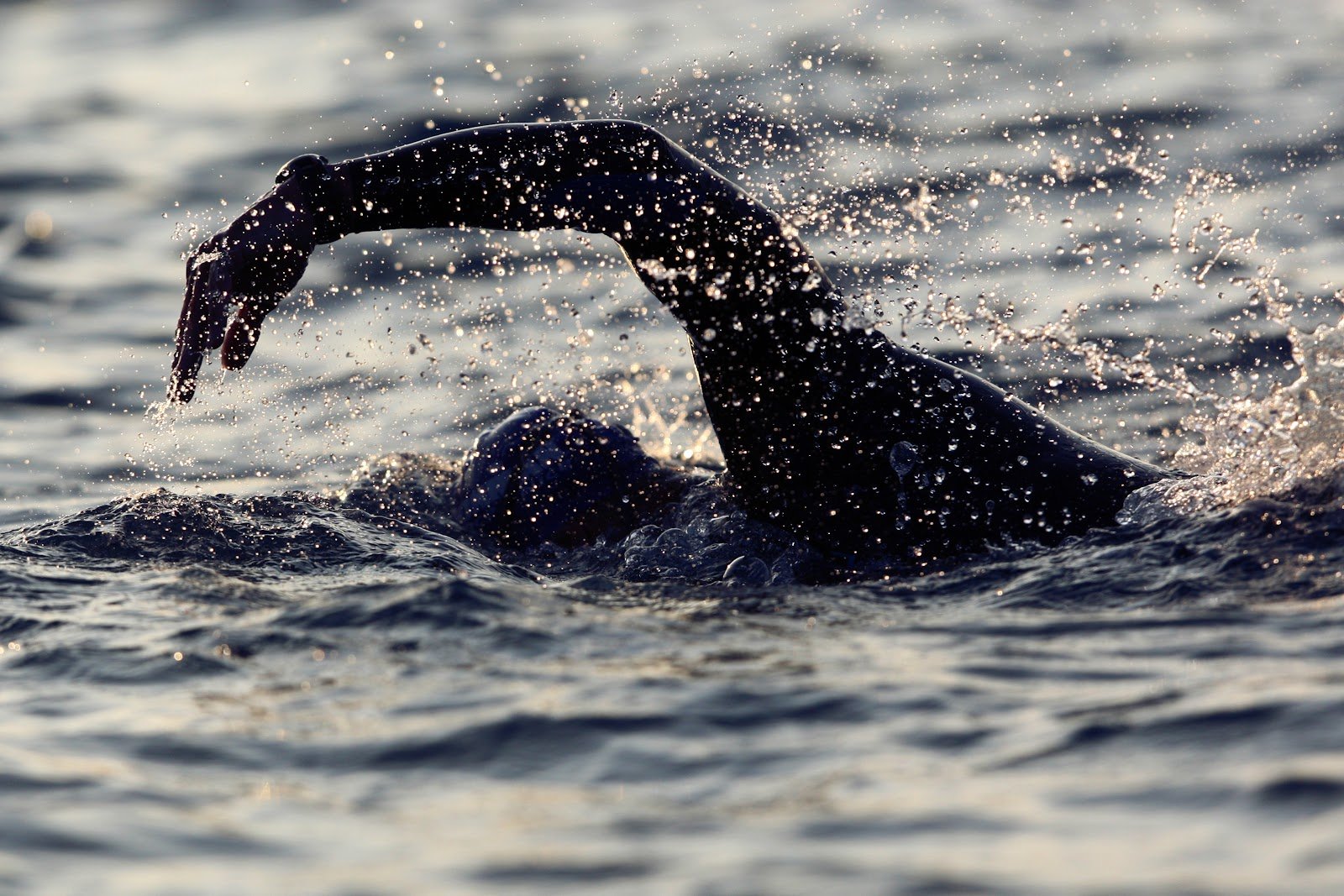 Тифлокомментарий: цветная фотография. На блестящей поверхности воды пловец заносит руку дугой для очередного гребка.