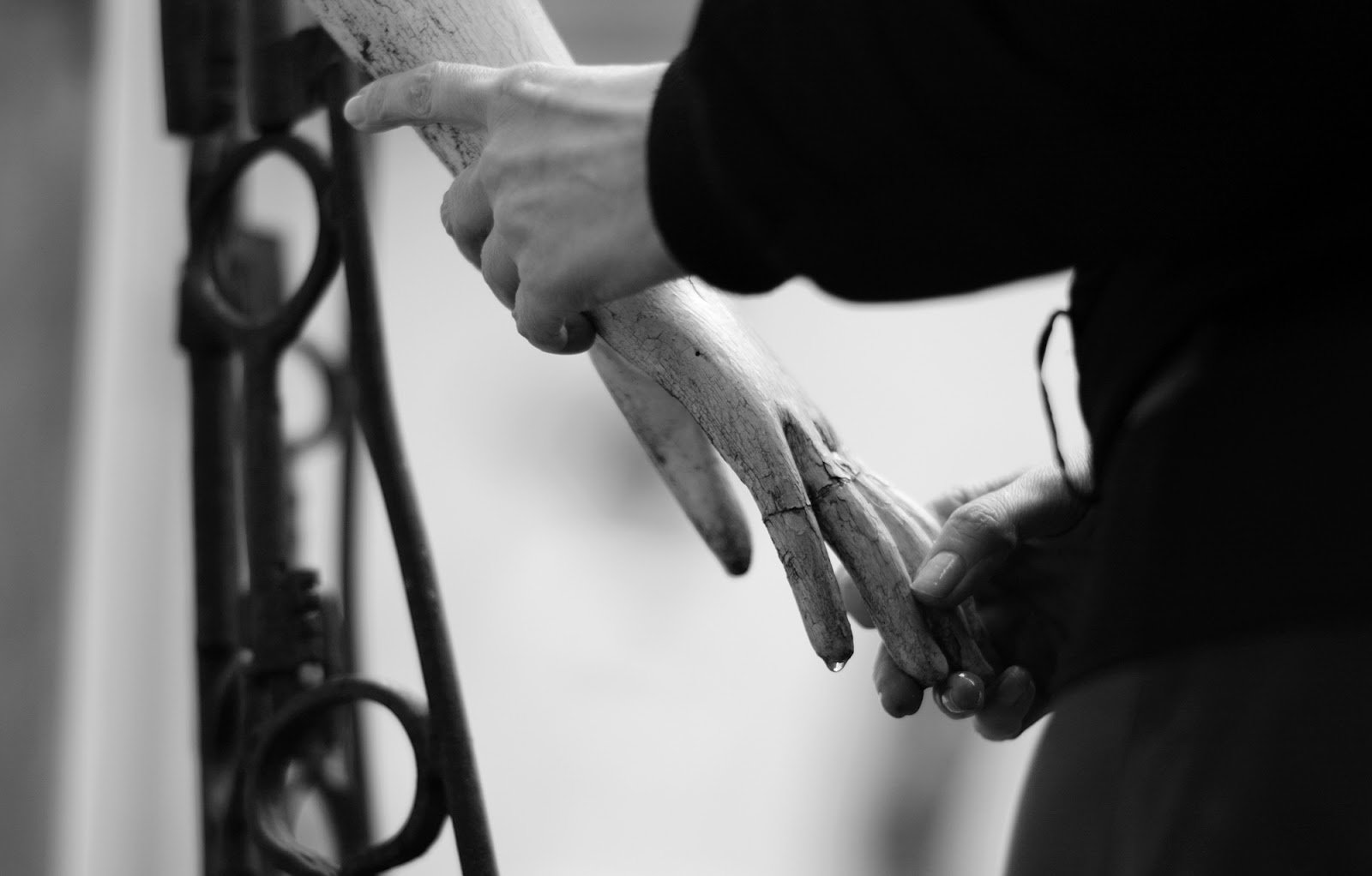 Тифлокомментарий: на черно-белой фотографии — руки Ирины Поволоцкой. Женщина держится за запястье и кончики пальцев руки, которая является частью инсталляции. На мизинце руки (фрагменте инсталляции) заметна капля воды.