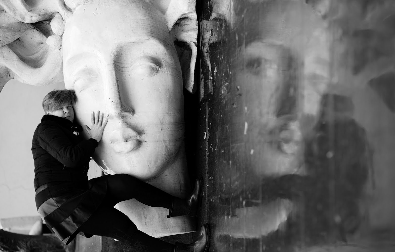 Тифлокомментарий: черно-белая фотография. Снимок перевернут на 90 градусов. В левой части фотографии — инсталляция, представляющая собой голову размером с человеческий рост. Ирина Поволоцкая наклонилась и прислонилась к щеке головы. У композиции высокий лоб, миндалевидные глаза, прямой нос и пухлые губы. В правой части фотографии — деревянный, покрытый лаком пол, в котором отражается Ирина, обнявшая инсталляцию.