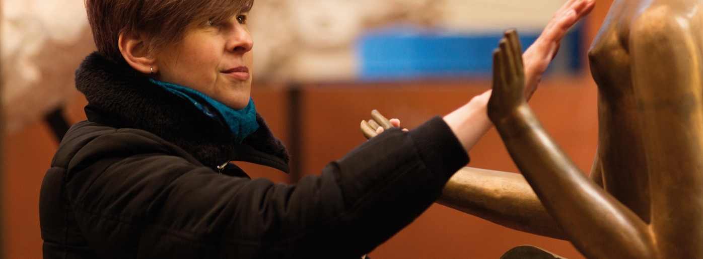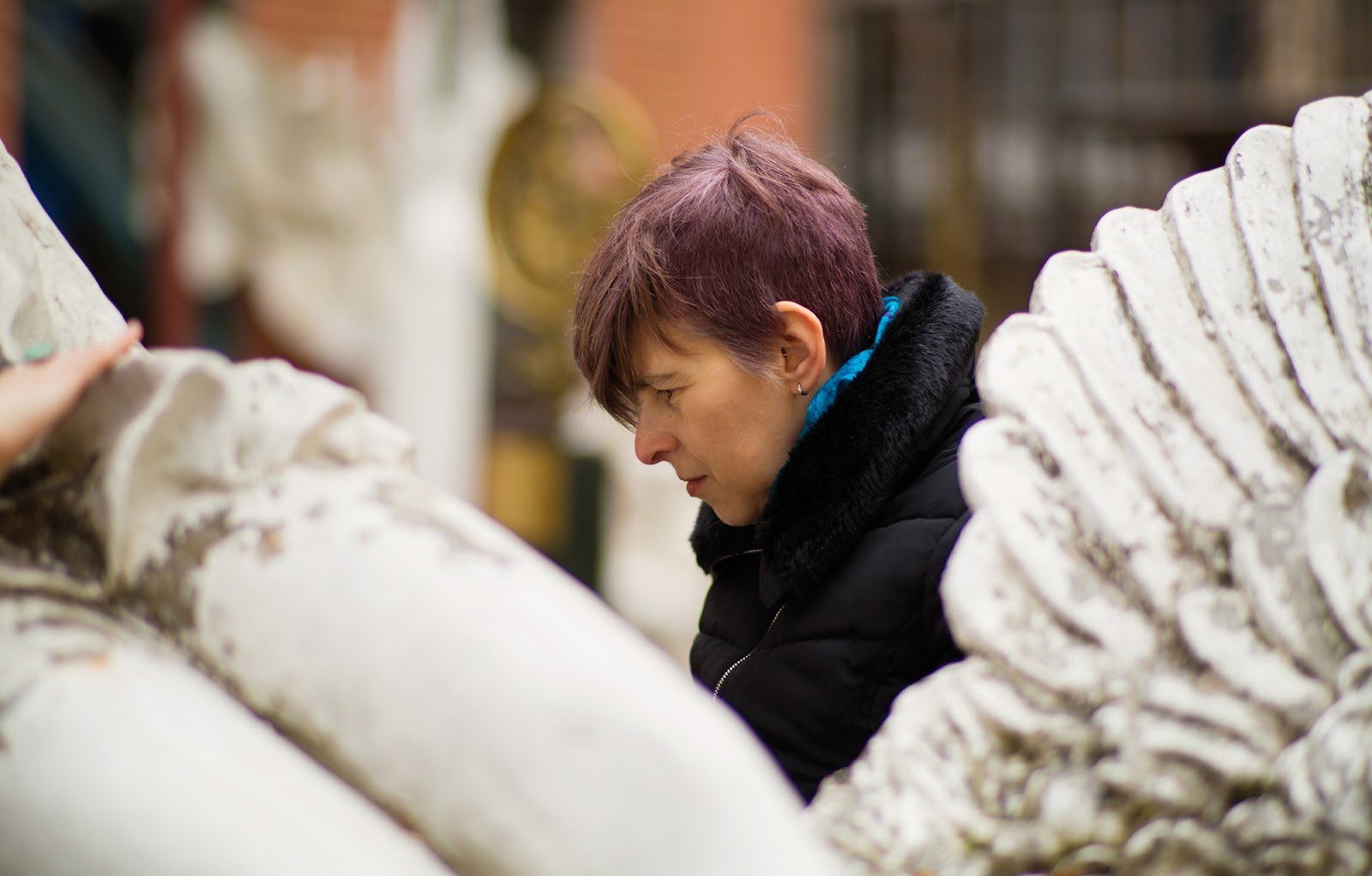 Тифлокомментарий: в центре цветной фотографии — Ирина Поволоцкая в профиль. Женщина стоит за большой скульптурой, склонив голову. Задний фон размыт.