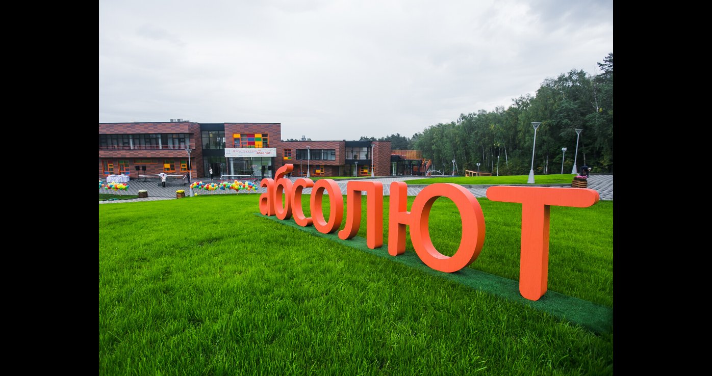 Тифлокомментарий: цветная фотография. На зеленой поляне у леса установлен логотип: оранжевые строчные буквы складываются в слово «абсолют». Позади расположен комплекс современных двухэтажных строений, выполненных в коричневом цвете с разноцветными яркими вставками. Это школа-интернат «Абсолют».