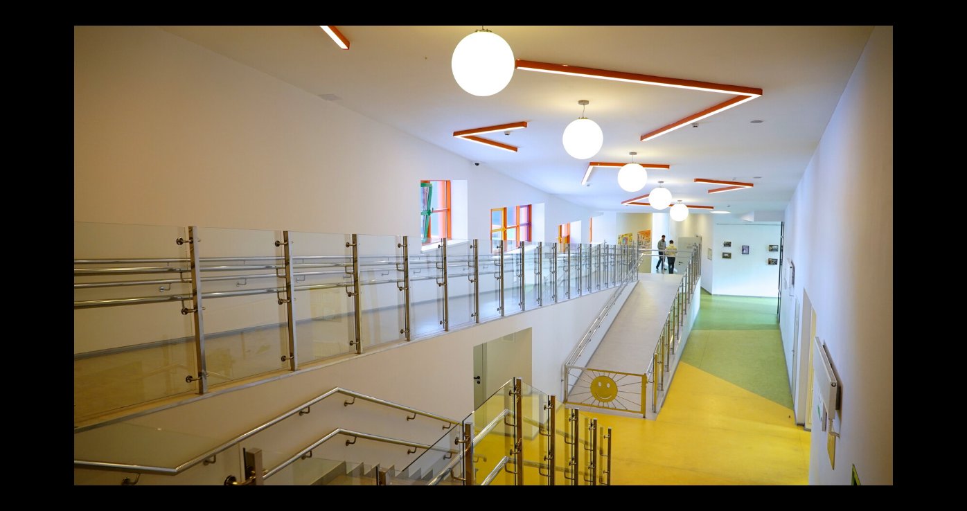 Тифлокомментарий: цветная фотография. Коридор школы «Абсолют». На следующий этаж ведет лестница и длинный двухсекционный пандус. У лестницы и пандуса стеклянные ограждения и двухуровневые металлические поручни. Зона пола перед лестницей выделена желтым цветом. Пространство школы очень светлое: белые стены прорезают горизонтальные окна, на потолке линейные светодиодные лампы и круглые светильники. Вдалеке на стенах висят яркие стенды и фотографии.