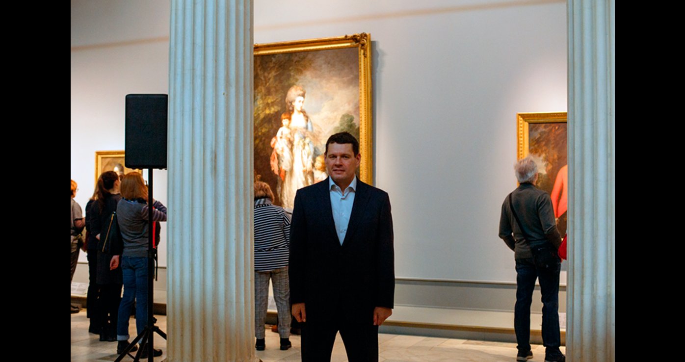 Тифлокомментарий: цветная фотография. Александр Светаков на выставке Томаса Гейнсборо в Пушкинском музее. Светлый зал с высоким потолком. Между колоннами стоит темноволосый мужчина в черном костюме и голубой рубашке с расстегнутой пуговицей на воротнике. У него открытое лицо, внимательный взгляд темных глаз и крупный нос. Губы складываются в едва заметную улыбку.