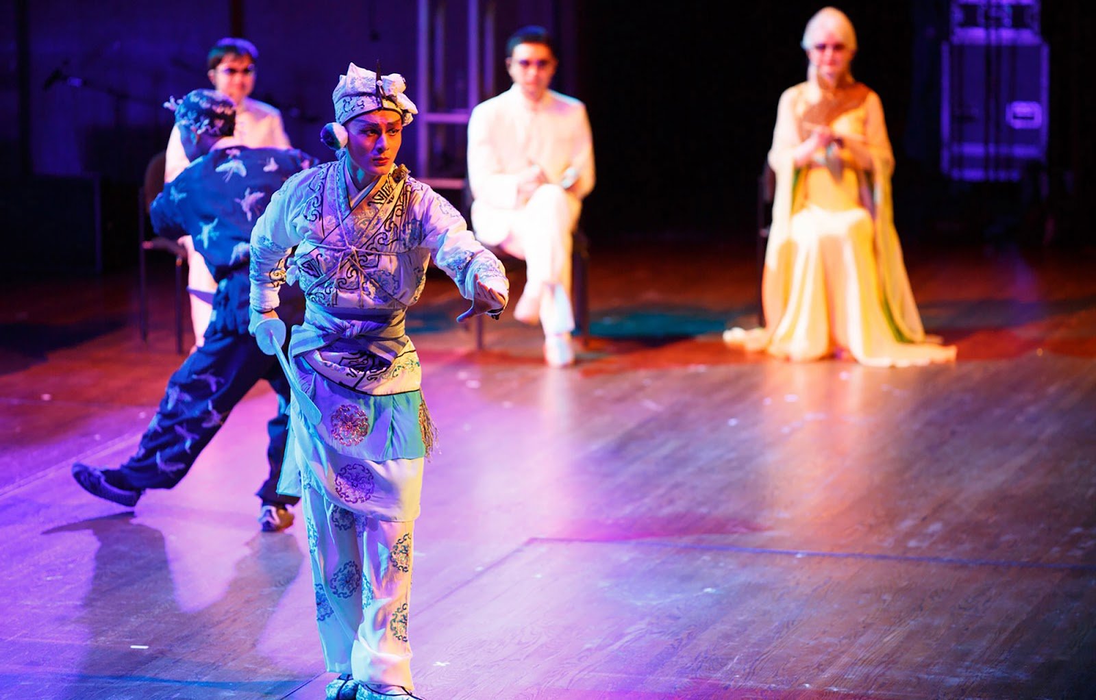 Тифлокомментарий: на цветном фото сцена спектакля. Вид из зала. На авансцене двое мужчин в гриме и в традиционных китайских нарядах. Один из них в светлом облачении на авансцене лицом к зрителю. Он запечатлен в боевой позиции с саблей в руке. Чуть позади спиной к нему — второй мужчина в темном наряде. Он тоже замер в боевой позе. На заднем плане сидят на стульях двое мужчин в белых костюмах и женщина в длинном белом платье и накидке. Они смотрят на двух бойцов.