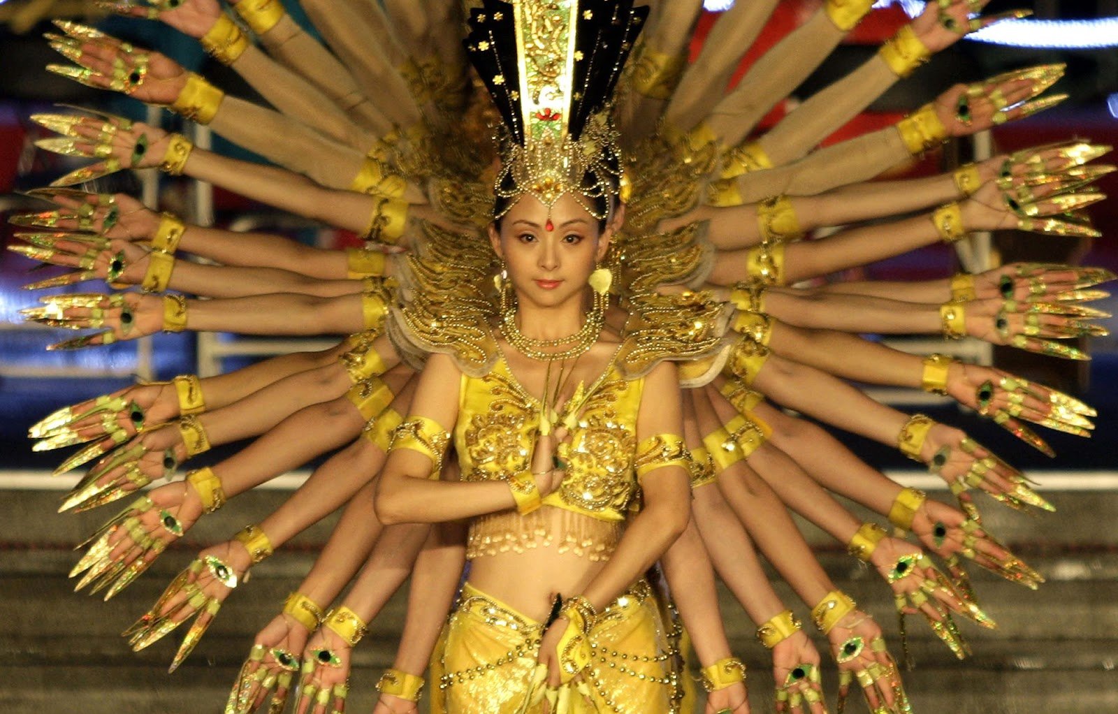Двадцать три танцовщицы в удивительной красоты золотых одеяниях стоят на сцене, как одна девушка с тысячью рук. Их руки совершают точные грациозные движения, глаза сияют: они исполняют танец милосердия Гуань Инь. Тысячерукая Гуань Инь в буддизме почитается как богиня милосердия и сострадания, защитница и спасительница. Тысяча рук Гуань Инь — это тысяча глаз, наблюдающих за миром и людьми. Богиня имеет тысячу обличий, воплощаясь в которые, приходит на помощь тем, кому она нужна.