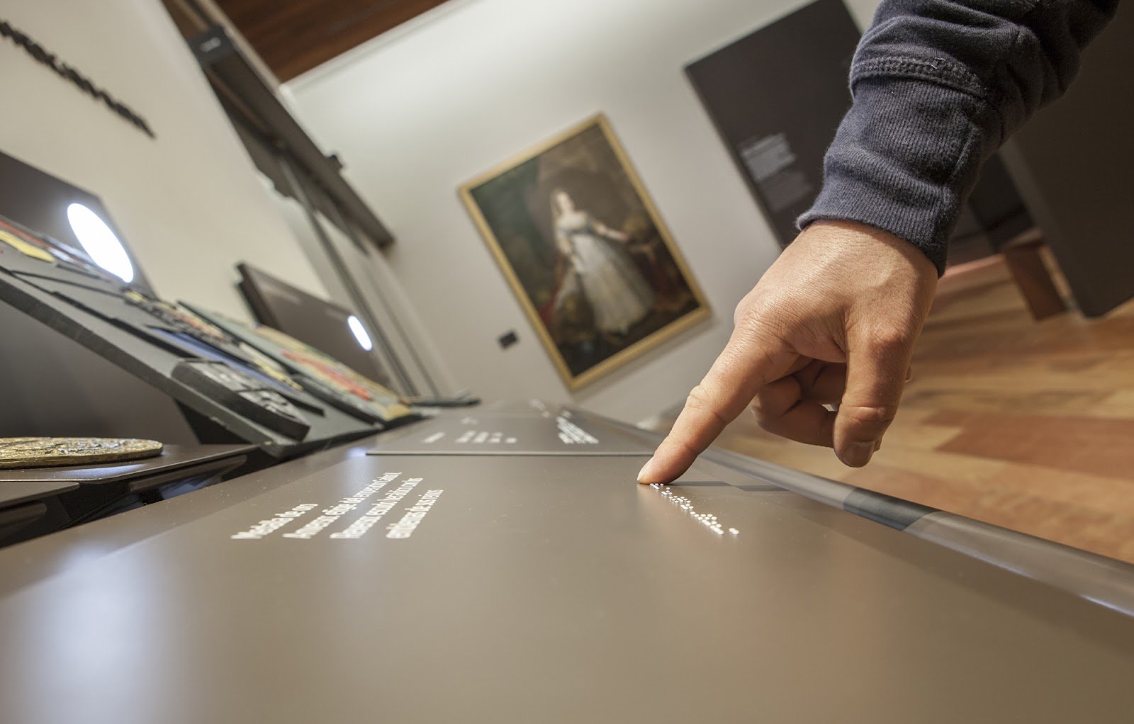 Тифлокомментарий: цветная фотография. Рука мужчины проводит указательным пальцем по шрифту Брайля. Это подпись, расположенная на специальной поверхности перед музейным экспонатом.