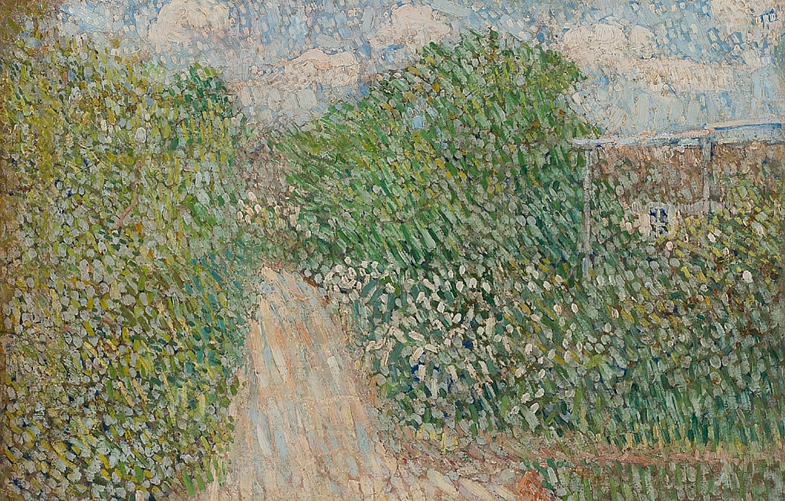 Тифлокомментарий: фотография картины Баранова-Россине «Дорожка в саду». Вертикальными мазками бежевых оттенков художник изобразил тропинку, уходящую вглубь сада. По обеим ее сторонам кусты. Ближе к земле зелень переходит в более светлые мазки. Справа очертаниями выделена изгородь. За кустами, там, куда уходит тропинка, голубое небо с легкими облачками.
