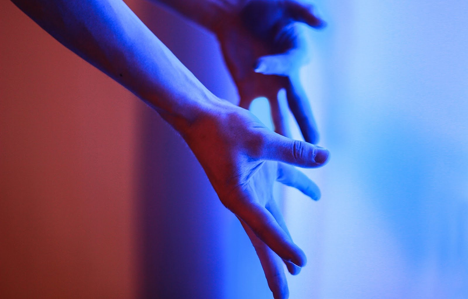 Тифлокомментарий: на снимке — в неоновом синем свете — кисти рук. Ладонь одной руки энергично раскрыта и направлена вперед, на другой руке указательный палец загнут к центру ладони, остальные широко расставлены.