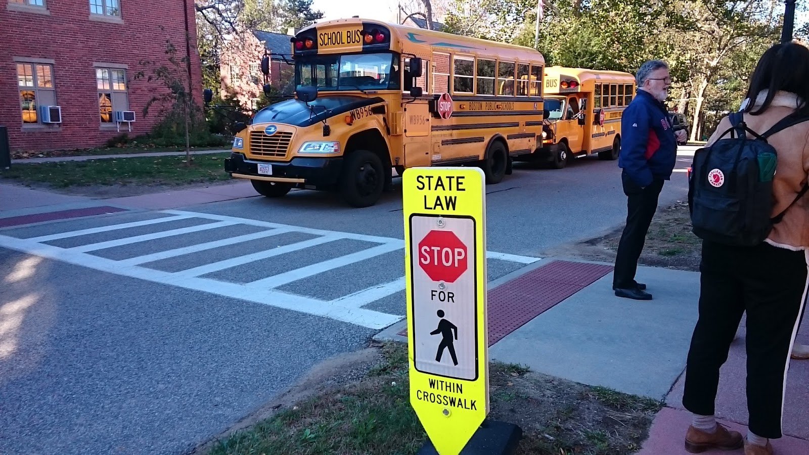 Тифлокомментарий: пешеходный переход на территории школы. Помимо обычной белой разметки перед светофором положена тактильная плитка красного цвета. Перед переходом невысокий знак STOP для машин, обязывающий пропустить пешеходов. На одной стороне дороги стоят мужчина и девушка, на другой стороне — желтые школьные автобусы.