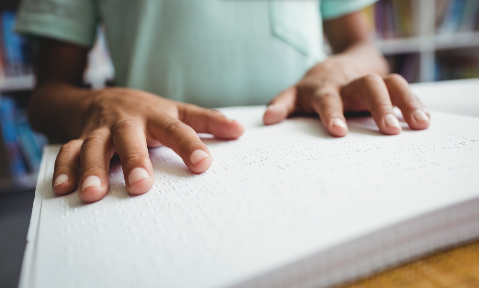 Тифлокомментарий: пальцы ребенка лежат на раскрытой книге, написанной азбукой Брайля.