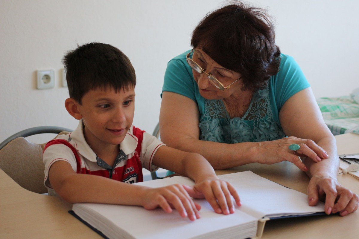 Тифлокомментарий: Венера Денискина сидит за столом рядом с мальчиком лет шести. Перед ним Брайлевская книга, он водит по ней руками и читает вслух. Она внимательно слушает. На ней бирюзовая блузка с вышивкой на груди, такого же цвета крупный перстень на правой руке. На мальчике красно-белая футболка. Он слегка улыбается.