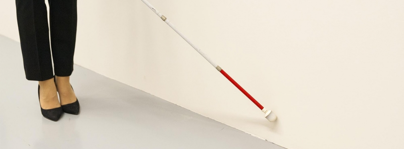 Выбрав направляющую, необходимо взять белую трость в противоположную от стены руку. Наконечник белой трости касается плинтуса или места соединения стены и пола.