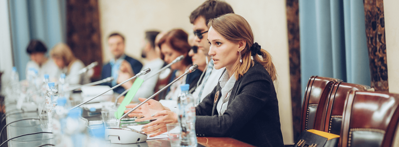 cветлое помещение с высокими окнами с тяжелыми серыми и темно-коричневыми шторами. За длинным овальным столом сидят участники сессии. Рядом с каждым бутылка воды и настольный микрофон на длинной ножке. Ближе всего к нам сидит Ксения Дмитриева – молодая стройная женщина с русыми волосами, забранными в хвост. На ней белая рубашка в темную крапинку, поверх надета темная накидка. Она говорит в микрофон, смотрит перед собой и разводит руки в объясняющем жесте. Справа от нее сидит Анатолий Попко. Перед ним стоит открытый ноутбук.