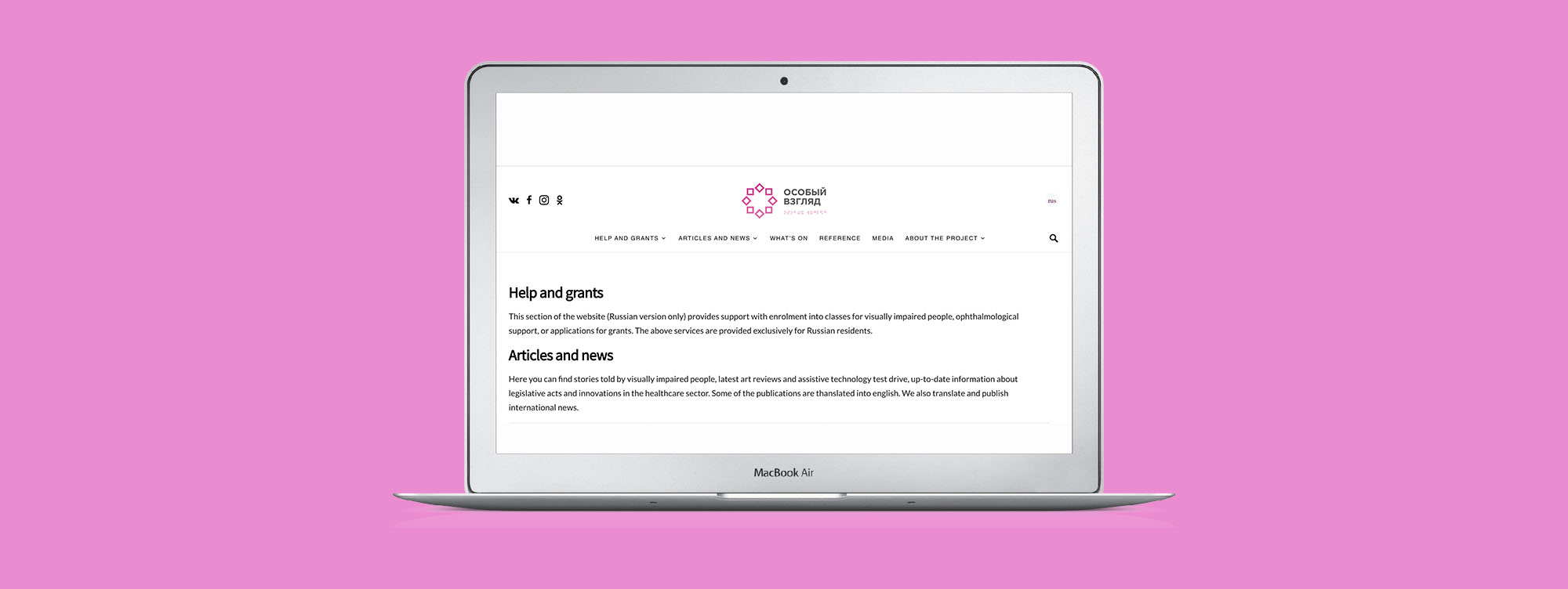 Англоязычным пользователям доступны новости мира инклюзии и информация о работе программы «Особый взгляд» благотворительного фонда «Искусство, наука и спорт». Также на сайте публикуются переводы полезных материалов «Особого взгляда» — об опыте российских тифлопедагогов и образовательных учреждений, о людях с нарушением зрения, о тифлокомментировании и многом другом.