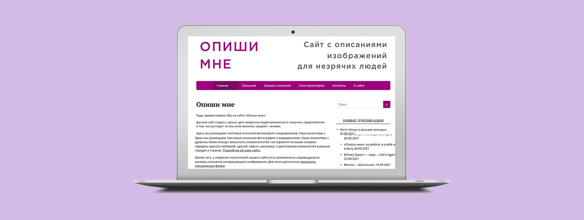 «Опиши мне» появился в 2015 году, у проекта есть и мобильное приложение. Сервис позволяет незрячим людям получить представление о том, как выглядят те или иные изображения. На сайте можно найти текстовые описания видеороликов, картинок, фотографий, составленные волонтерами. Пользователи с нарушением зрения могут также самостоятельно заказывать описания изображений, которые их интересуют.