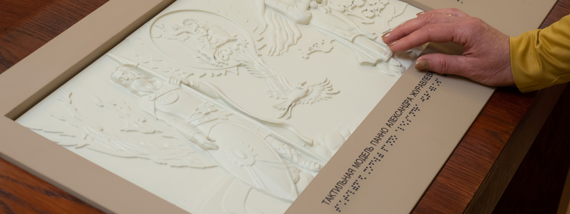 «Чтобы лучше понять, что изображено на этой тактильной модели, можно послушать аудиотекст. <...>Приятный женский голос не только расскажет о процессе создания работы, но и детально опишет, что на ней изображено», — отметила заведующая отделом по работе с посетителями Екатерина Машегирова.