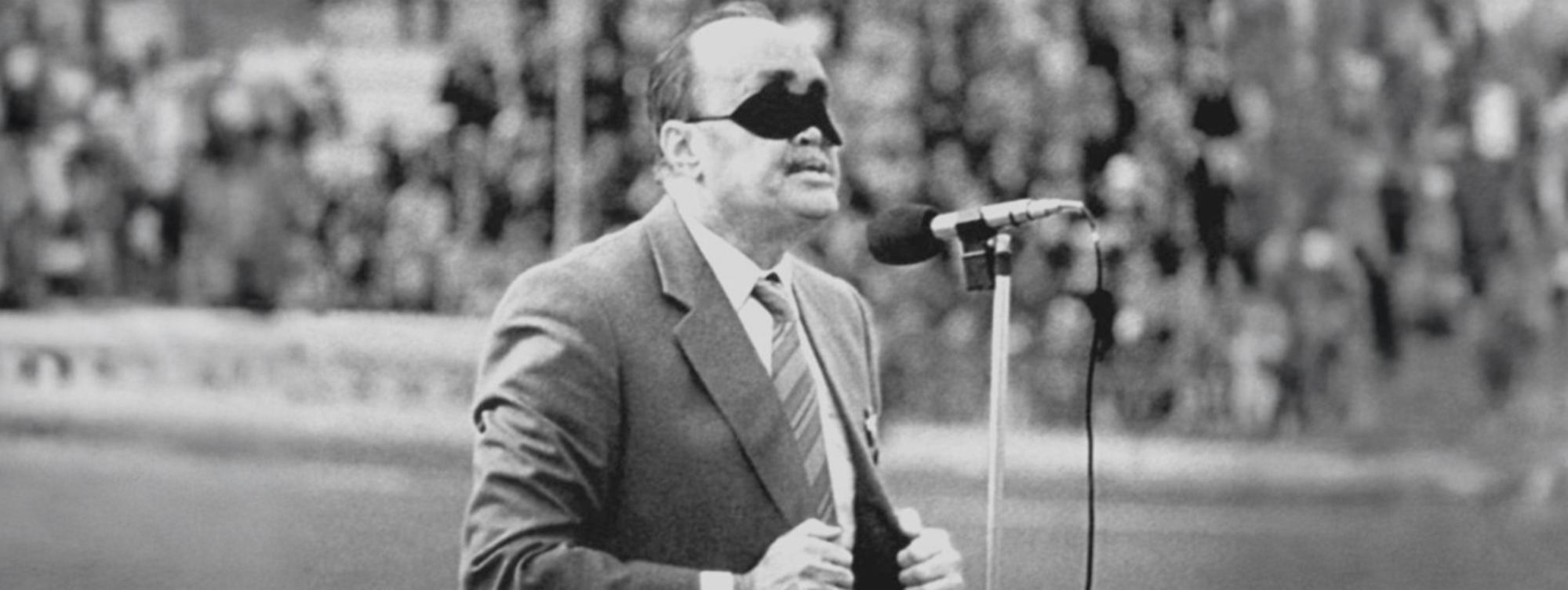 Тифлокомментарий: черно-белая фотография. Советский поэт и прозаик Эдуард Асадов стоит перед микрофоном на стадионе с заполненными зрителями трибунами, декламирует свои стихи. У него короткие темные волосы с залысинами у висков, усы. На нем черная маска, закрывающая только глаза, светлая рубашка, темные костюм и галстук, на груди орден.
