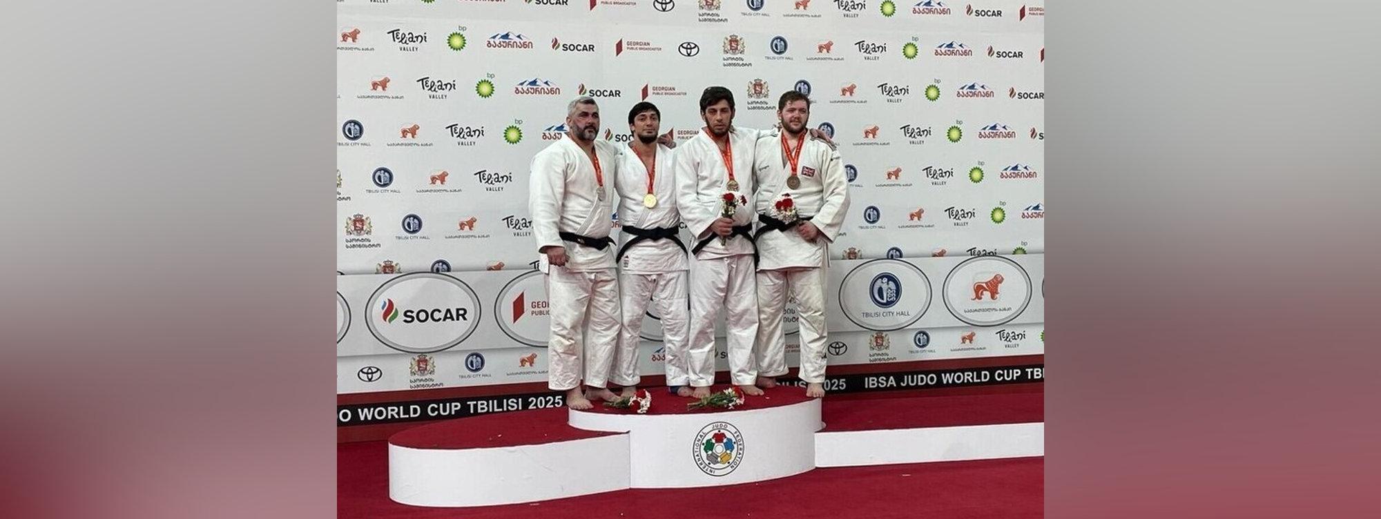 Тифлокомментарий: цветная фотография. На верхней ступени красно-белого пьедестала почета, обнявшись, стоят победители и призеры соревнований Кубка мира по дзюдо среди незрячих и слабовидящих людей. Это четверо бородатых мужчин, они одеты в белые кимоно с черными поясами и медалями на красных лентах на груди. Двое держат в руках небольшие красно-белые букеты, еще два букета лежат у ног спортсменов. За спиной дзюдоистов — баннер с логотипами партнеров Кубка.