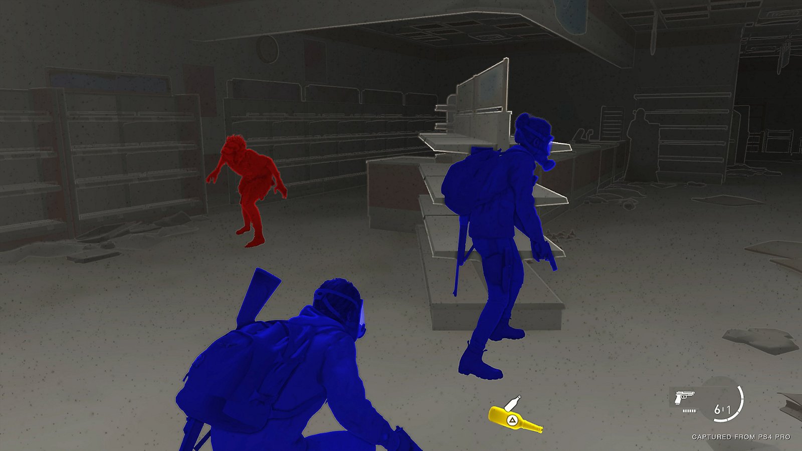 Тифлокомментарий: фрагмент компьютерной игры. Вариант для слабовидящих. На сером фоне три контрастных силуэта. Два из них — персонажи синего цвета в противогазах, вооруженные дробовиками и пистолетами. Мужчина присел, женщина движется вперед. Между ними на полу лежит желтая бутылка. Слева движется персонаж красного цвета, похожий на зомби. Помещение выглядит как супермаркет с полками и пустыми стеллажами.
