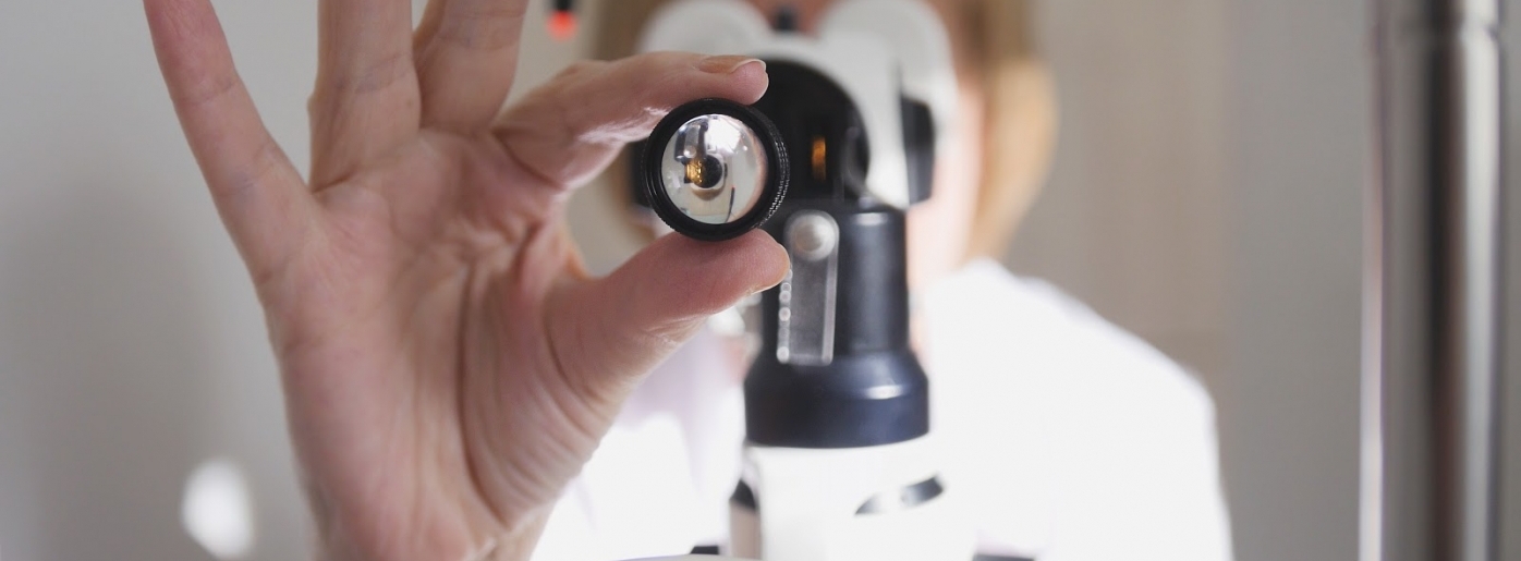 Тифлокомментарий: цветная фотография. Правая рука подстраивает окуляр офтальмологического аппарата для диагностики зрения с круглой зеркальной линзой. Врач в белом халате сидит за аппаратом и смотрит в объектив.