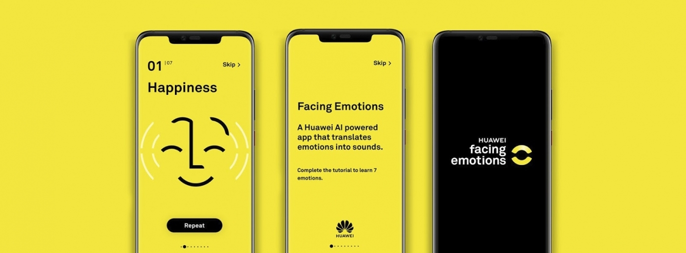 Тифлокомментарий: цветной коллаж. На желтом фоне три смартфона с интерфейсом приложения Facing Emotions. На экране левого смартфона на желтом фоне изображена черная иконка с улыбающимся лицом, от которой в стороны расходятся светло-желтые дуги. Выше черная надпись на английском языке «Счастье». Внизу черная кнопка с белой надписью «Повторить». На экране центрального смартфона на желтом фоне черная надпись с названием приложения и короткой информацией о нем. Ниже логотип Huawei в виде расположенных полукругом черных лепестков. На экране правого смартфона на черном фоне белая надпись в три строки Huawei Facing Emotions и логотип в виде двух желтых дуг, образующих полукруг.