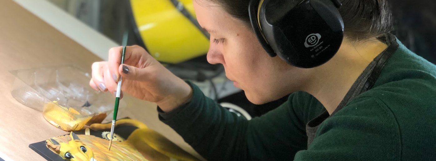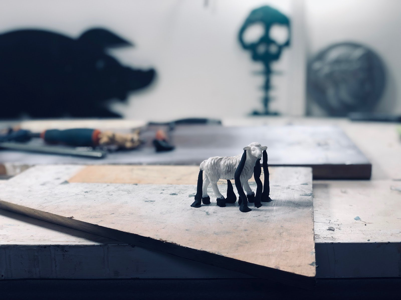 Тифлокомментарий: цветная фотография. На столе на фанерной доске стоит маленькая статуэтка белой овечки с черными копытцами. Это тактильная модель по мотивам фотографии Луиса Камнитцера. Голову, живот и хвост овечки поддерживают черные технологические трубки. На столе вдалеке лежат рабочие инструменты скульптора. У стены слева направо размещены: черная доска в форме свиньи, тактильная копия картины Такаси Мураками с изображением черного черепа и позвоночника на белом фоне и круглый рельеф из алюминия с профилем древнеримской богини Дианы.