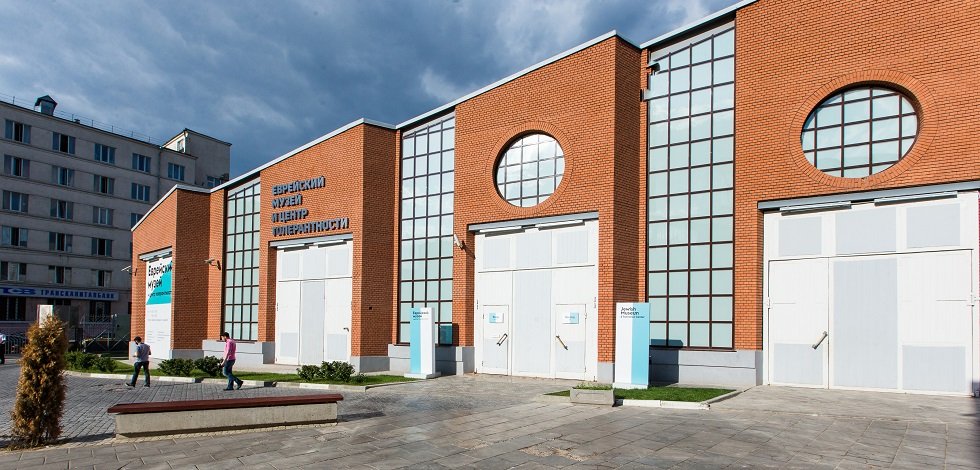 Тифлокомментарий: цветная фотография. Красно-кирпичное здание Бахметьевского гаража в Москве. Фасад имеет четыре кирпичных выступа, между которыми – участки стены со сплошным остеклением. В каждом выступе организован высокий проем, который служил раньше для въезда автотранспорта, а сейчас закрыт железными воротами. На первом проеме слева – бело-зеленый баннер Еврейского музея. Над вторыми воротами – темная объемная надпись прописными буквами «Еврейский музей и центр толерантности». Над двумя проемами справа – круглые окна. Крыша здания поднимается по диагонали слева направо. Перед зданием расположена покрытая брусчаткой площадь и длинная скамья без спинки.