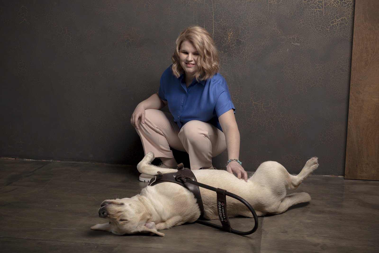 Тифлокомментарий: цветная фотография. В серой комнате девушка сидит на корточках и гладит по животу палевого лабрадора, лежащего рядом. На лабрадоре коричневая шлейка поводыря, собака растянулась и зажмурилась от удовольствия. У девушки русые завитые волосы по плечи, она улыбается. Она одета в голубую рубашку с короткими рукавами, брюки телесного цвета и розовые ботинки.