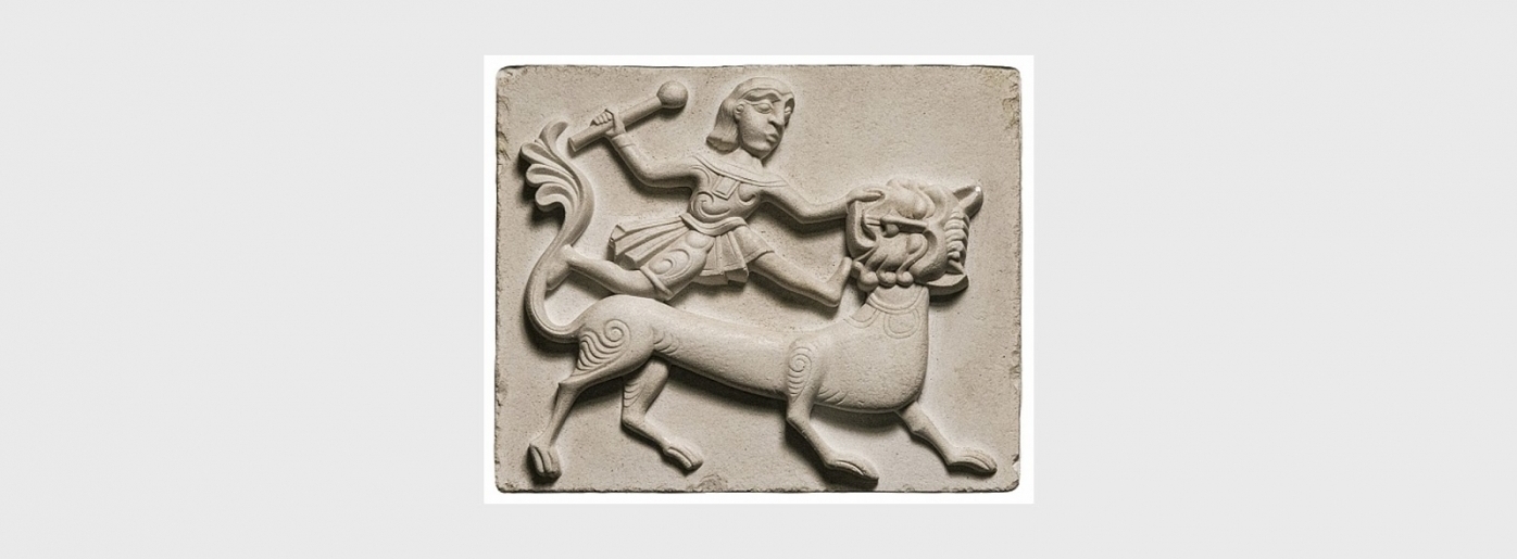 Тифлокомментарий: цветная фотография. Бежевая прямоугольная плитка с барельефом из искусственного камня. На барельефе изображена сцена борьбы: юноша в воинском одеянии вскакивает на льва. Он изображен в прыжке, одной ногой упирается в голову льва, другой — в хвост. Левой рукой он держит льва за пасть, а правой замахнулся на него оружием, похожим на булаву, — жезлом с круглым наконечником. Персонажи стилизованы, у льва человеческие черты лица и худое тело, морда неестественно развернута к воину, кисточка хвоста напоминает лепестки цветка.