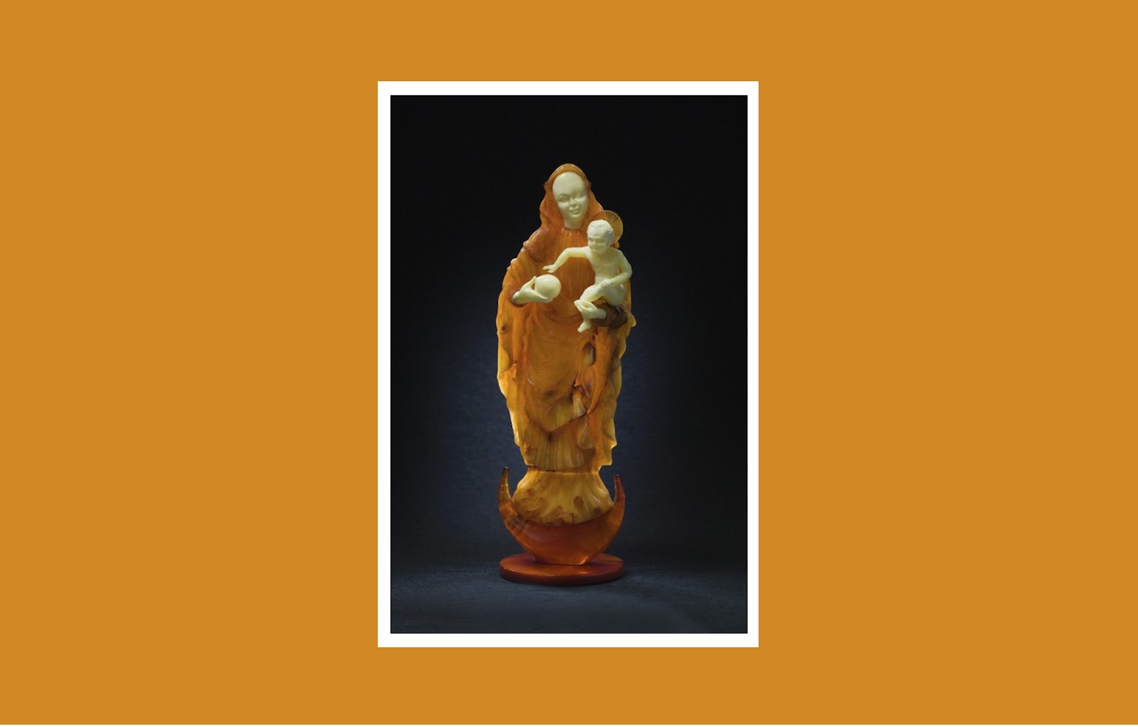 Тифлокомментарий: цветная фотография в белой рамке на оранжевом фоне. Статуэтка из непрозрачного янтаря «Мария с младенцем». На подставке в форме полумесяца стоит Богородица с умиротворенным выражением лица, немного склонив голову сторону. Она держит на согнутой левой руке обнаженного сидящего младенца. В правой руке у нее шар, к которому тянется ребенок. На Богородице длинная туника, поверх нее длинная накидка, покрывающая голову. Длинные волнистые волосы обрамляют овальное лицо с высоким лбом и ниспадают на грудь. Густые короткие волосы младенца зачесаны назад. Над его головой полупрозрачный нимб с лучами, исходящими из середины диска. Искусно выточены черты лица и все элементы струящейся ткани. Лицо, шея, кисти Богоматери, младенец и шар белые, ее одеяние, волосы и постамент медового цвета.