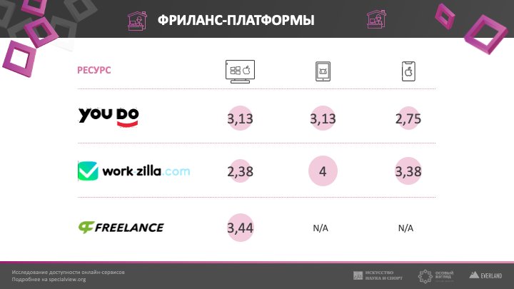 YouDo. Средняя доступность сайта и мобильного приложения на Android. Доступность приложения на iOS — ниже среднего.